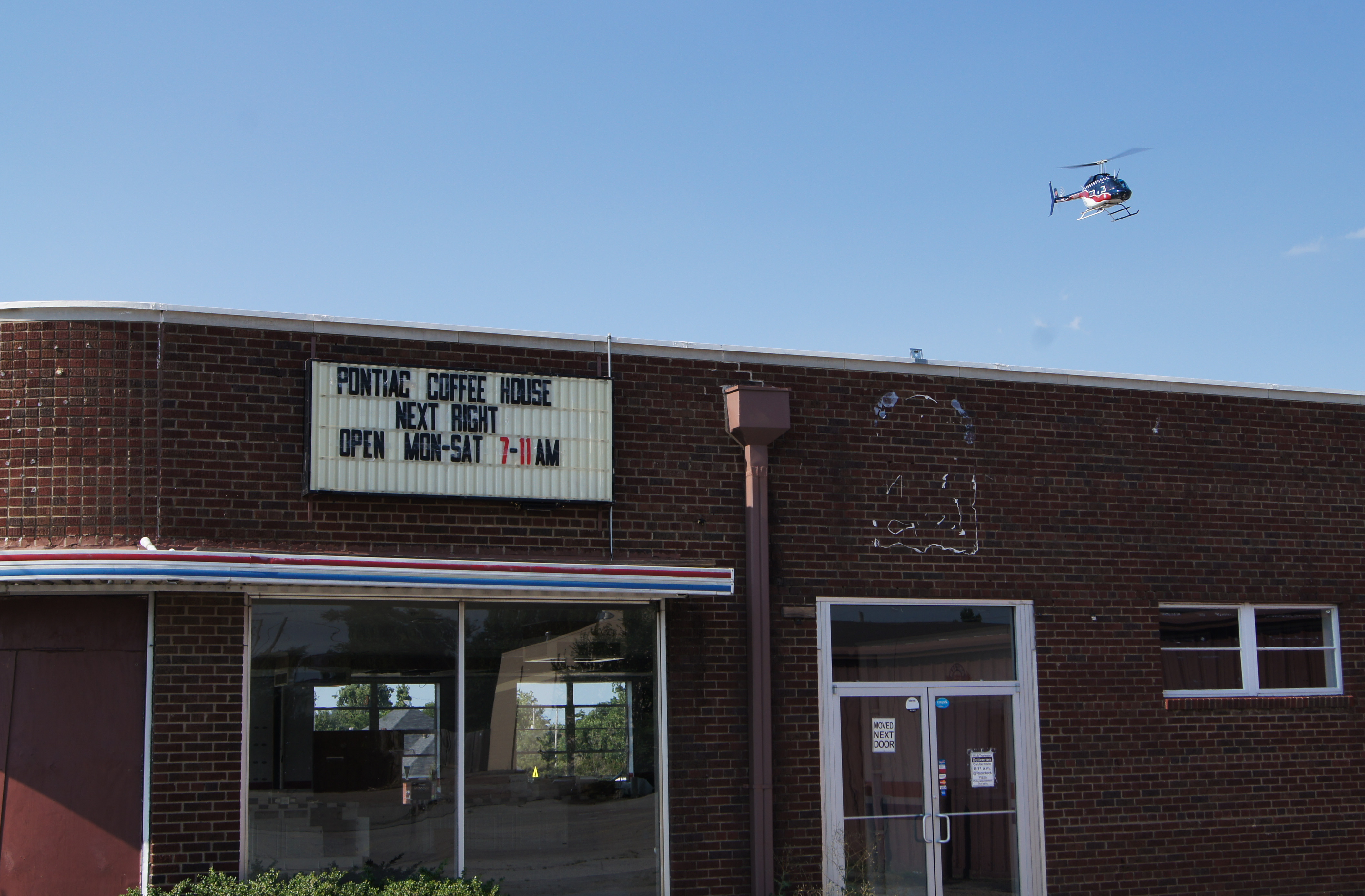 I’m standing in the Pontiac’s parking lot. A man in a red Dodge Ram drives up and stops directly in front of me and my camera, blocking my view right as I am about to press the shutter. He asks if I’m lost.