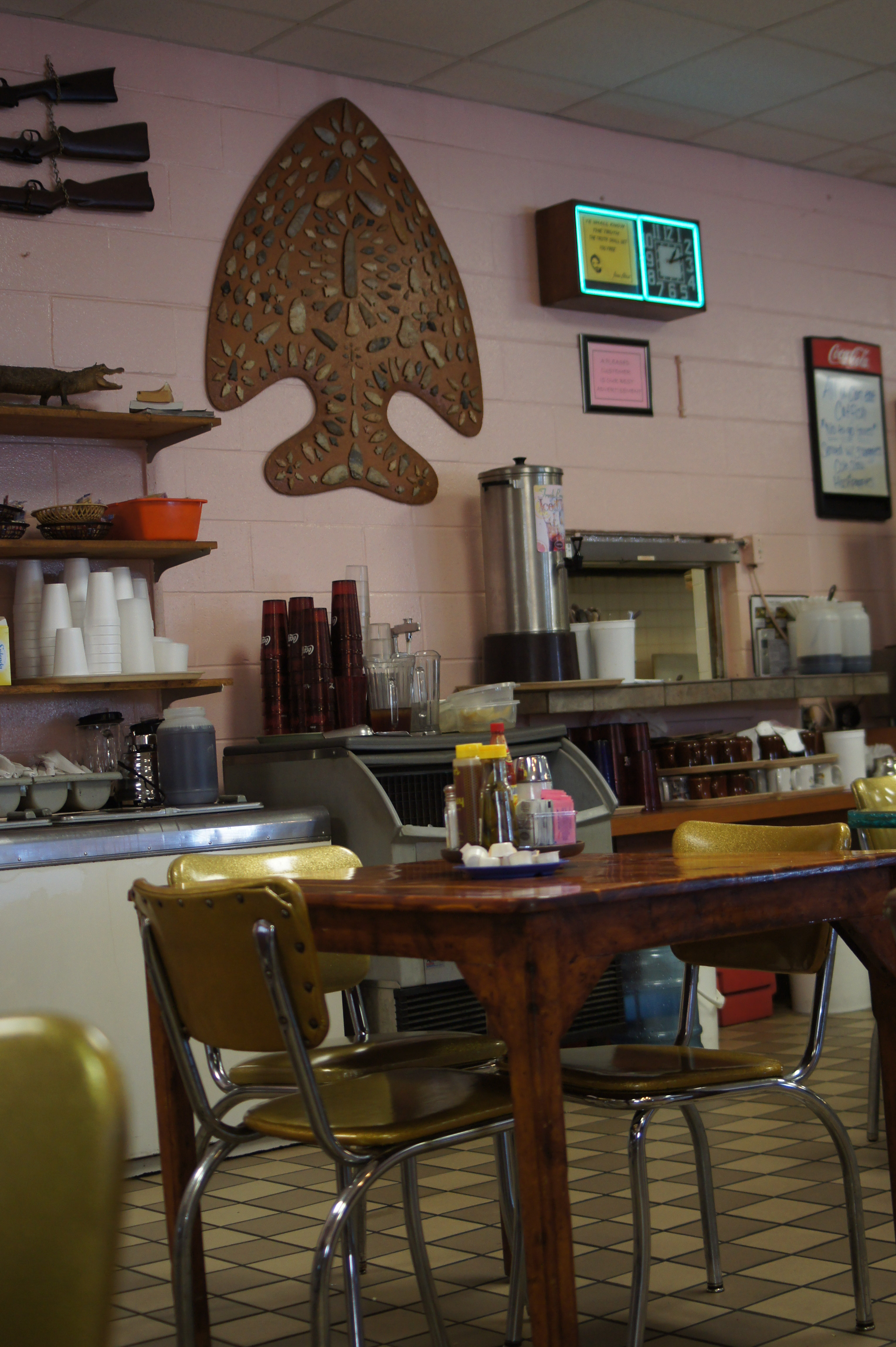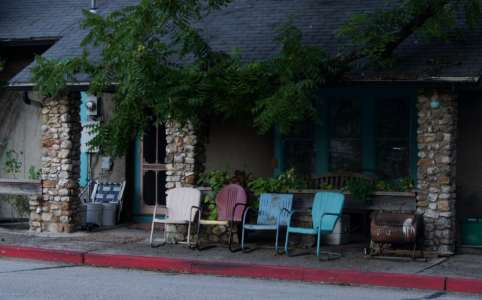 A couple of weekends ago, I had a chance to revisit one of my favorite sights in Eureka Springs: a line of four old motel chairs on a sidewalk across the street from Ermilio’s. The chairs are usually occupied by the brother of the restaurant’s owner and his buddies. The evening I visited, they happened to be empty–and while there is one chair too many for this set of threes, I can’t pass up the chance to include a photo of them here.