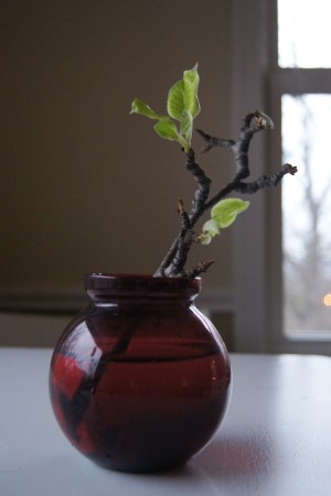 It took exactly one month longer than I thought, but one of the pear twigs I cut on December 4 now has leaves–pale green, soft leaves.